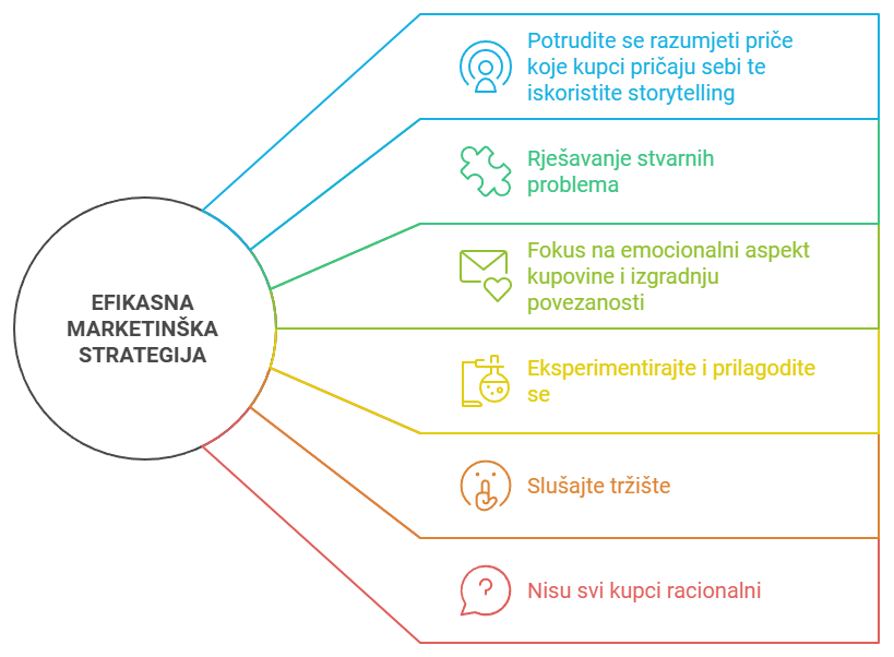 Ljudi često djeluju iracionalno pod utjecajem emocija i kulturnog konteksta. Nemojte očekivati da će kupci uvijek donositi racionalne odluke – uzmite u obzir njihove dublje motivacije.